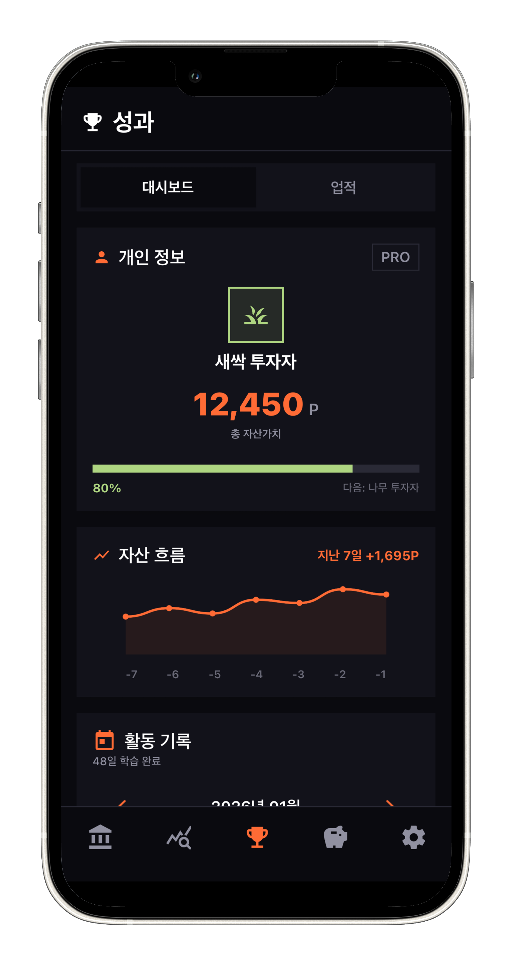 4단계에 걸친 10단계 성장 시스템. 식물 성장→금속 등급→보석 등급→칭호 등급. 단순한 스트릭이 아닌, 진정한 장기 성장 여정.