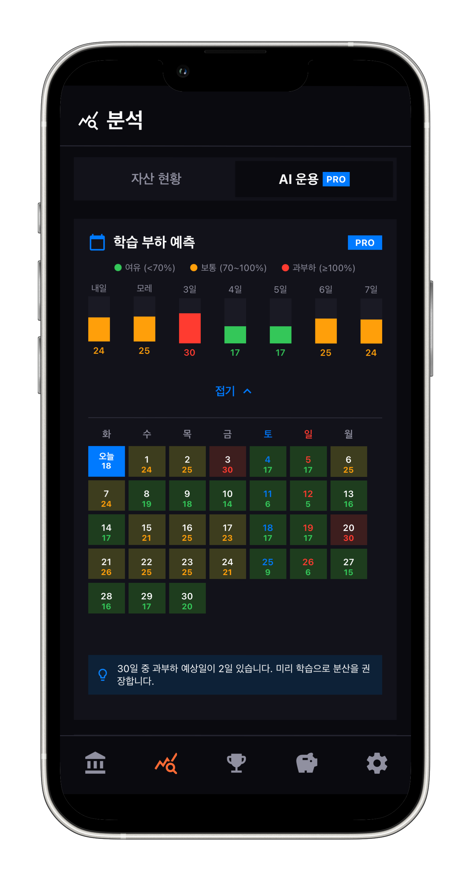 자산현황 리포트, 7일 성과 차트, 심층 AI 분석. 기억 상태와 위험 수준별로 분류된 인지 포트폴리오를 핀테크 대시보드처럼 확인하세요.