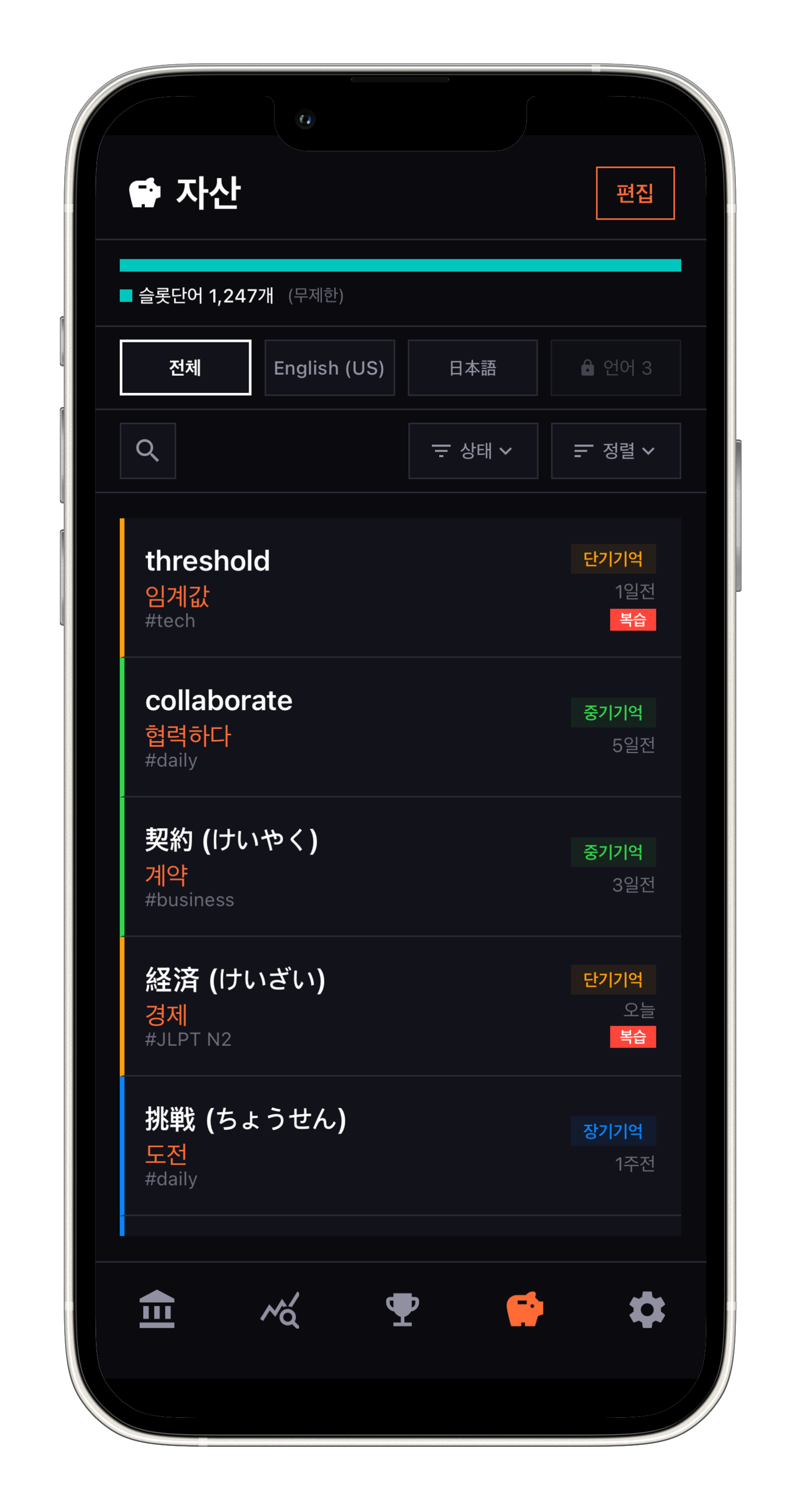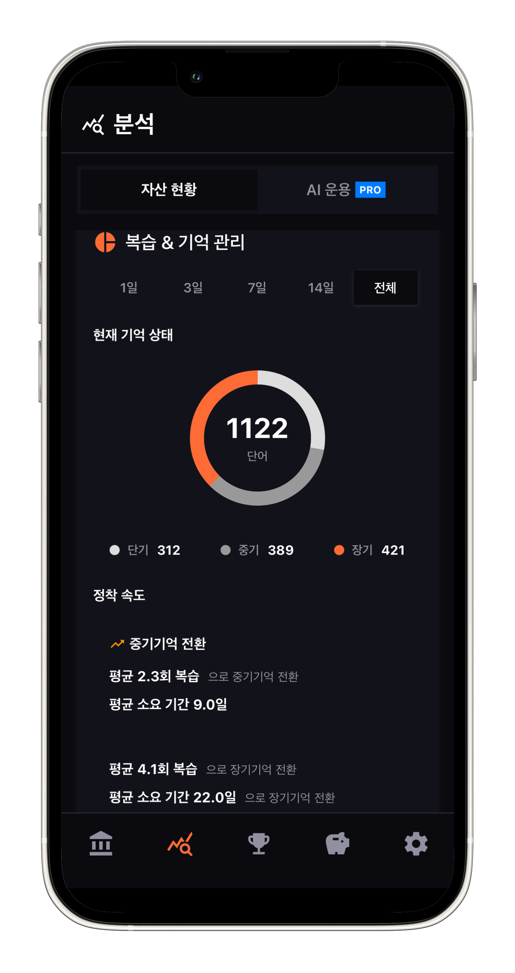 슬롯 안의 단어는 풀 매니지먼트를 받습니다: FSRS 스케줄링, 일일 복습 큐, 성장 추적, AI 운용. 전문적으로 관리되는 인지 자산.