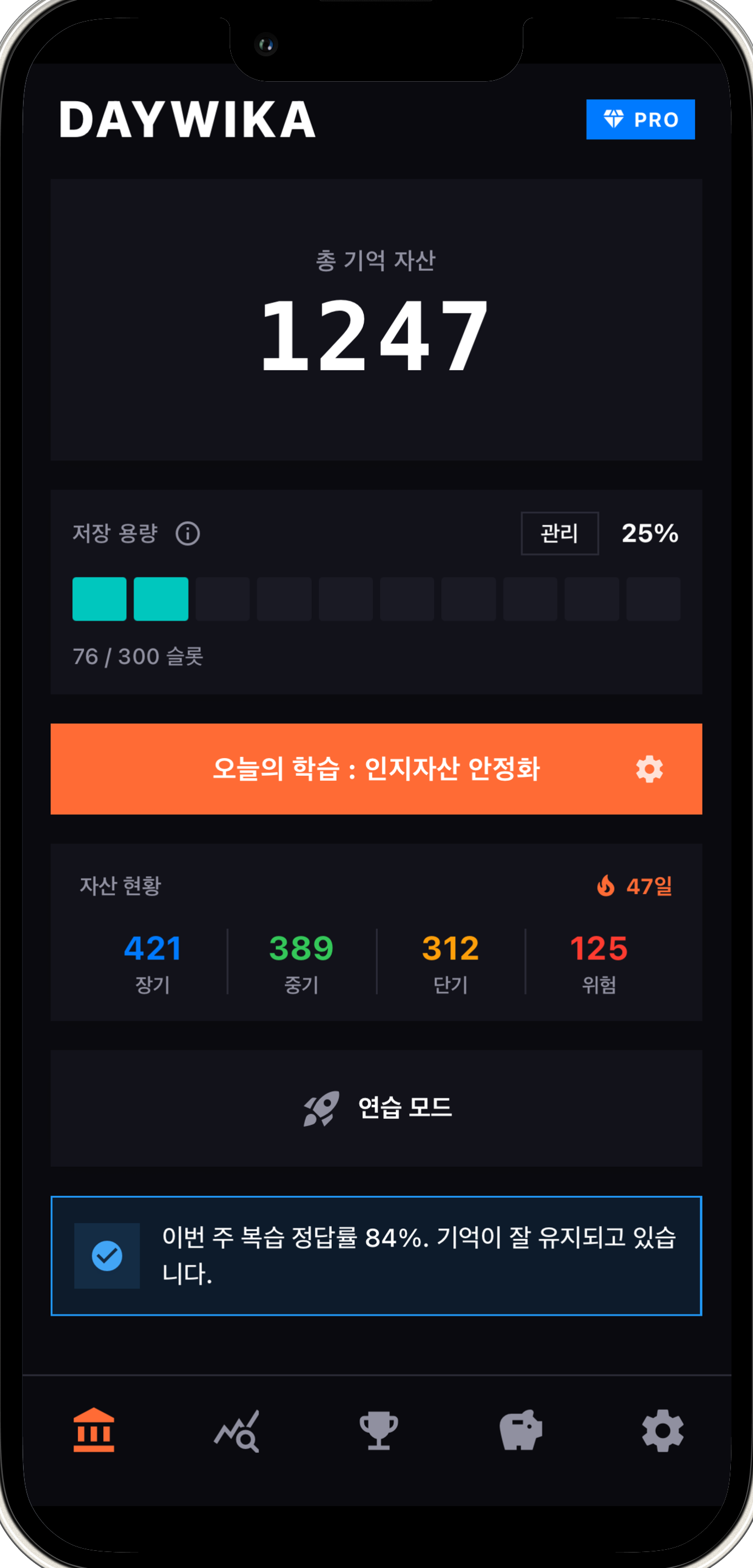 매일 10분: 단기→중기→장기기억. 인지 자산이 안정화되고 복리로 성장합니다.